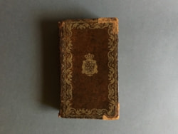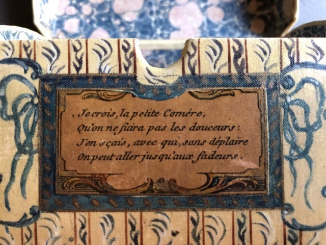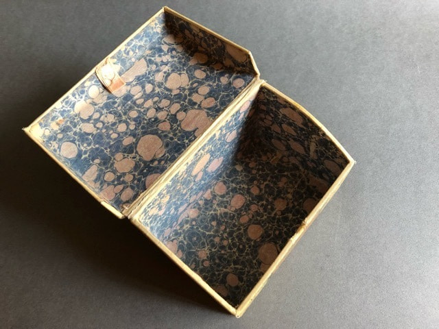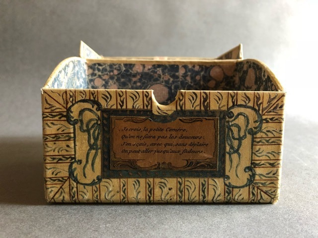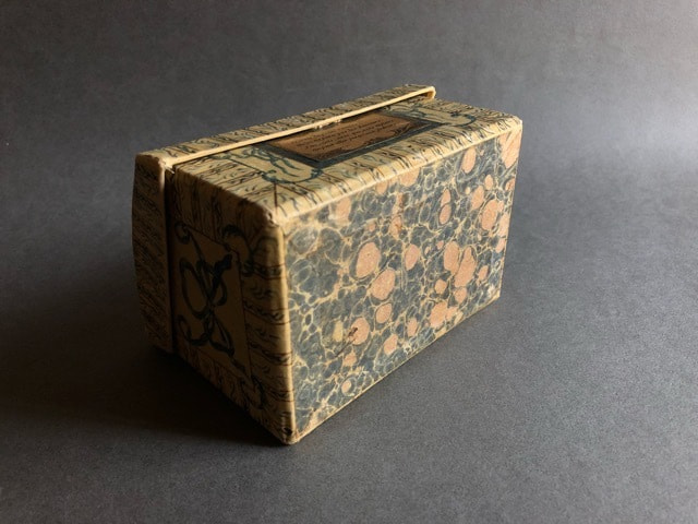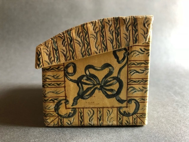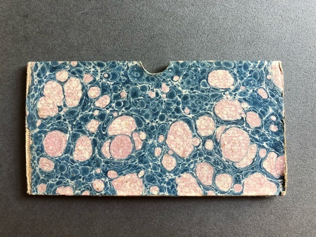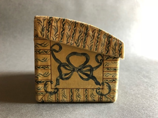 こちらは厚紙に布を貼り、更に版画のモチーフやマーブル紙などで装飾を施しておりまうが、薄黄色の布には総手描きでリボンや模様が描かれており、かなりの時間と労力がかけられたことを物語ります。