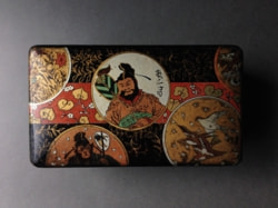 蓋に団扇のようなものを持った猿と男性、そして鳥のモチーフを中心にオリエンタル全開の絵柄が施されておりますが、日本というより中国といった趣です。