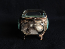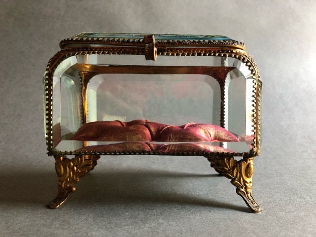 分厚い面取りガラスに覆われたジュエリーボックスはフランスのアンティークに同じスタイルのものが多く見られますので、フランス製である可能性もございますが、ハンガリーのブダペストのお土産品として売られていたものの様です。