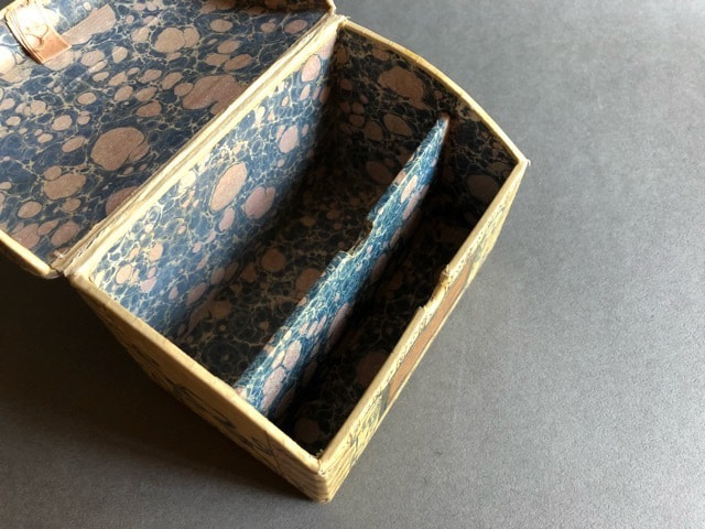 本来の用途はカードの整理用ではないかと思われ、内側に2箇所仕切りが付いていた跡があり、そのうちの1枚が残されております。