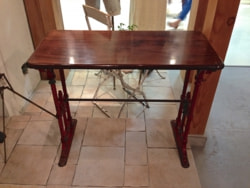 赤くペイントされた鉄脚の美しい装飾がポイントのテーブル。